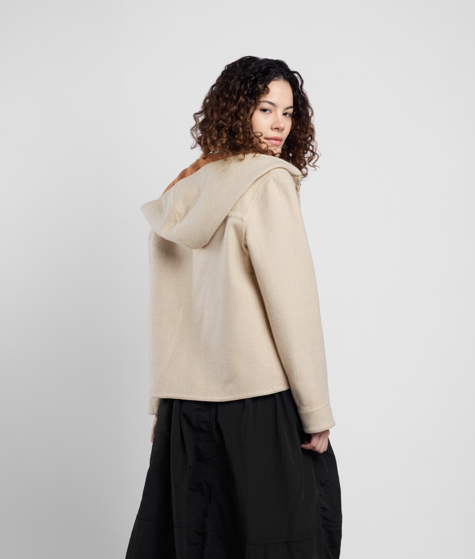 Casaca corta con capucha, pensada para brindar comodidad y versatilidad. Confeccionada en una mezcla de 60% Baby Alpaca y 40% Lana de Oveja, esta prenda ofrece abrigo ligero con un tacto suave. Su diseño reversible permite usarla por ambos lados, ofreciendo dos estilos en una sola prenda. Presenta cierre frontal oculto y bolsillos discretos.